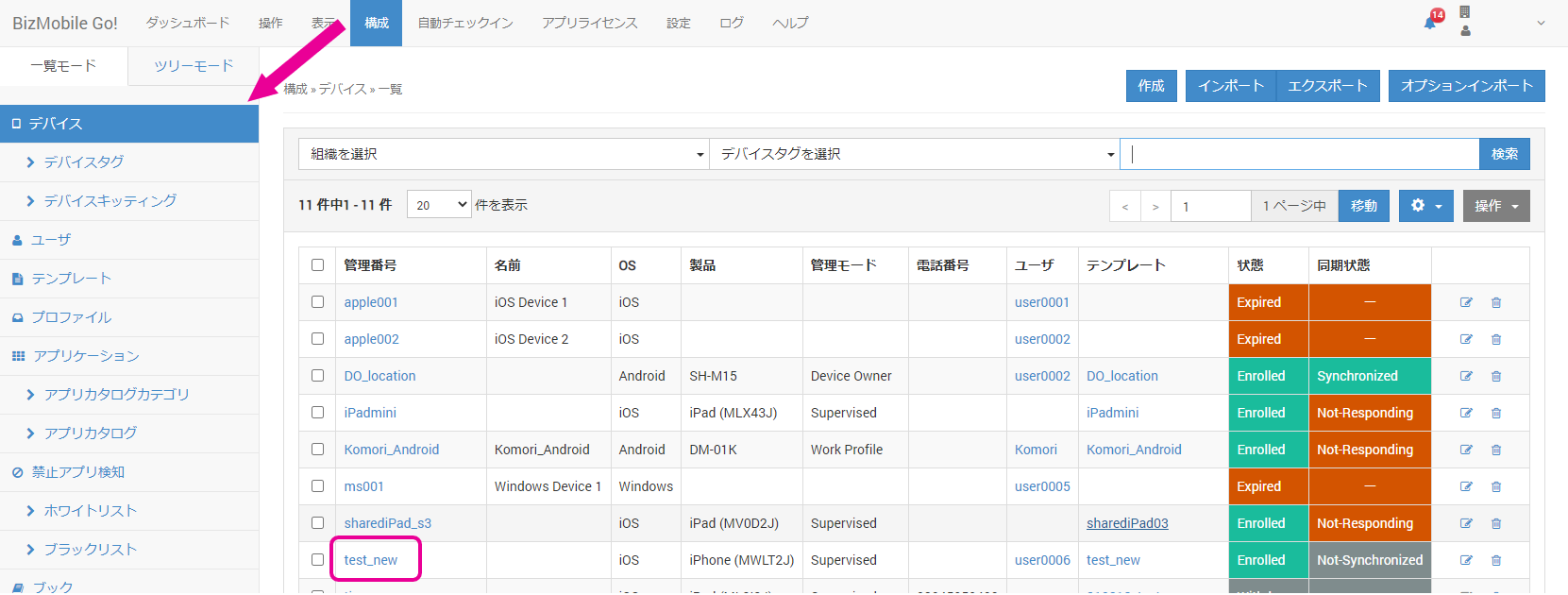1. 構成>デバイス より、デバイス一覧画面から対象のデバイスを選択します。