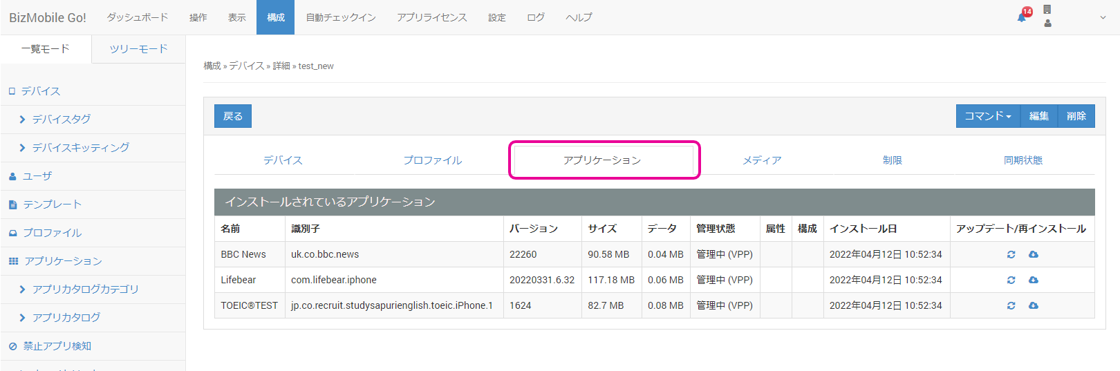 デバイス上でのアプリの再インストールが完了したことは、次回以降の同期処理後、デバイス>詳細 の同期状態タブから確認できます。
