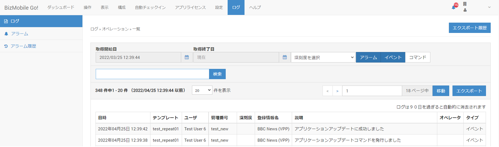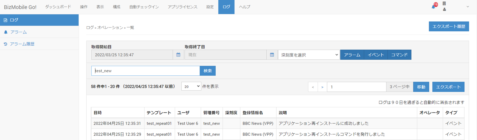 デバイス>詳細 の同期状態タブにあるログを確認するをクリックすると、このデバイスで絞り込みをかけたログ一覧画面へ遷移できます。