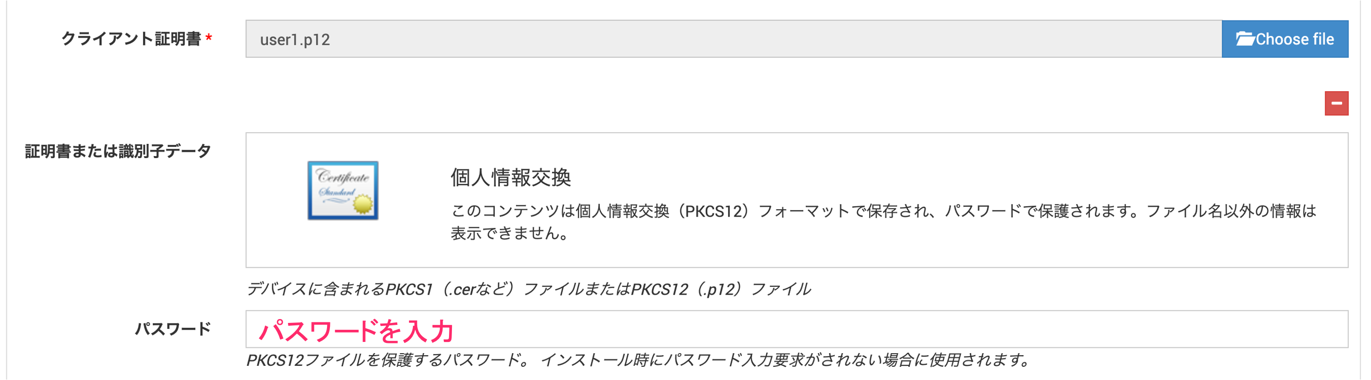3. 証明書名、パスワードを入力します。