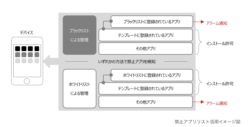 禁止アプリを検知するための仕組みとして、BizMobile Go!では、ホワイトリストブラックリストを利用します。