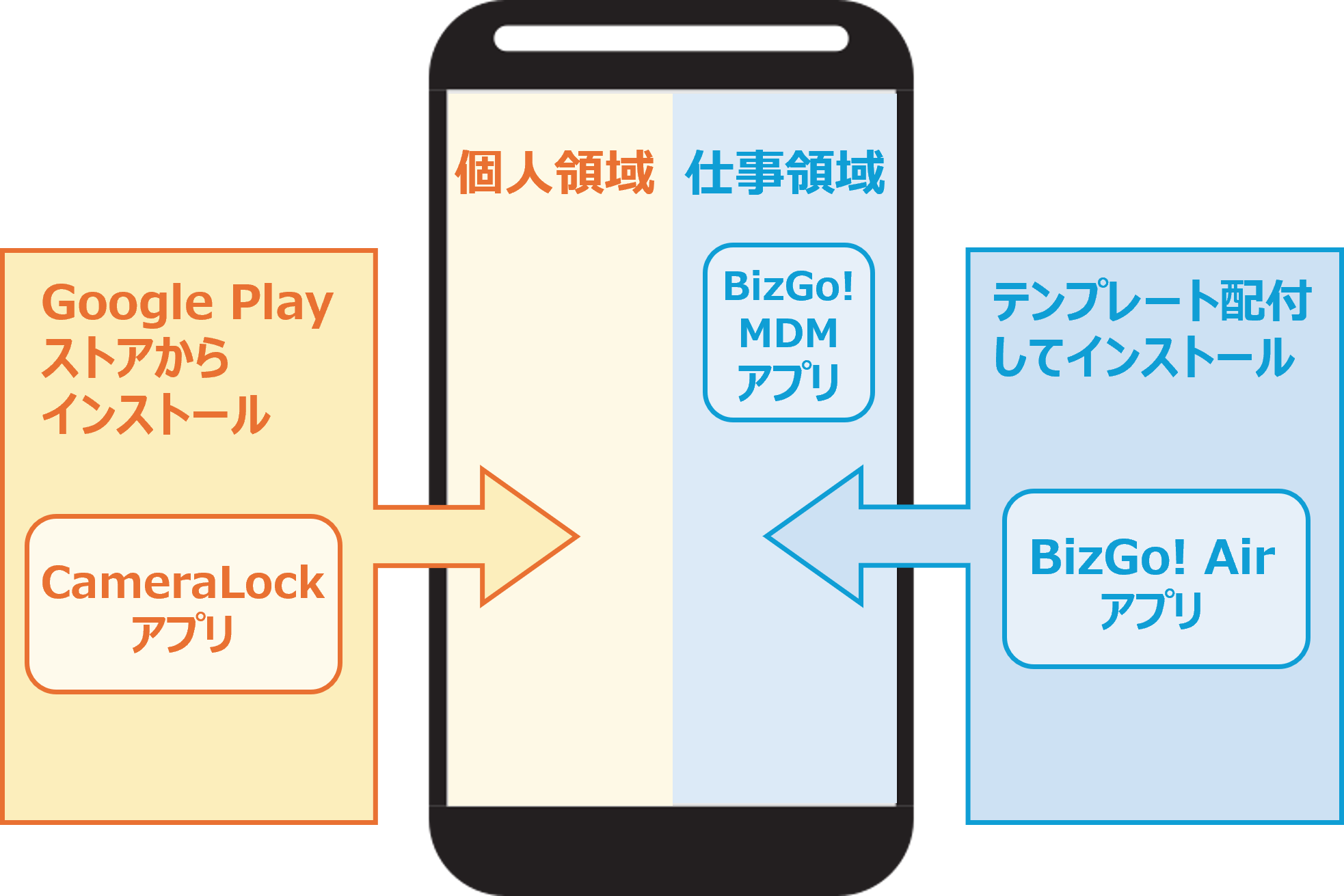 • CameraLockアプリでは個人領域のカメラ使用を制限できますが、仕事領域のカメラ制限はプロファイルで設定する必要があります。