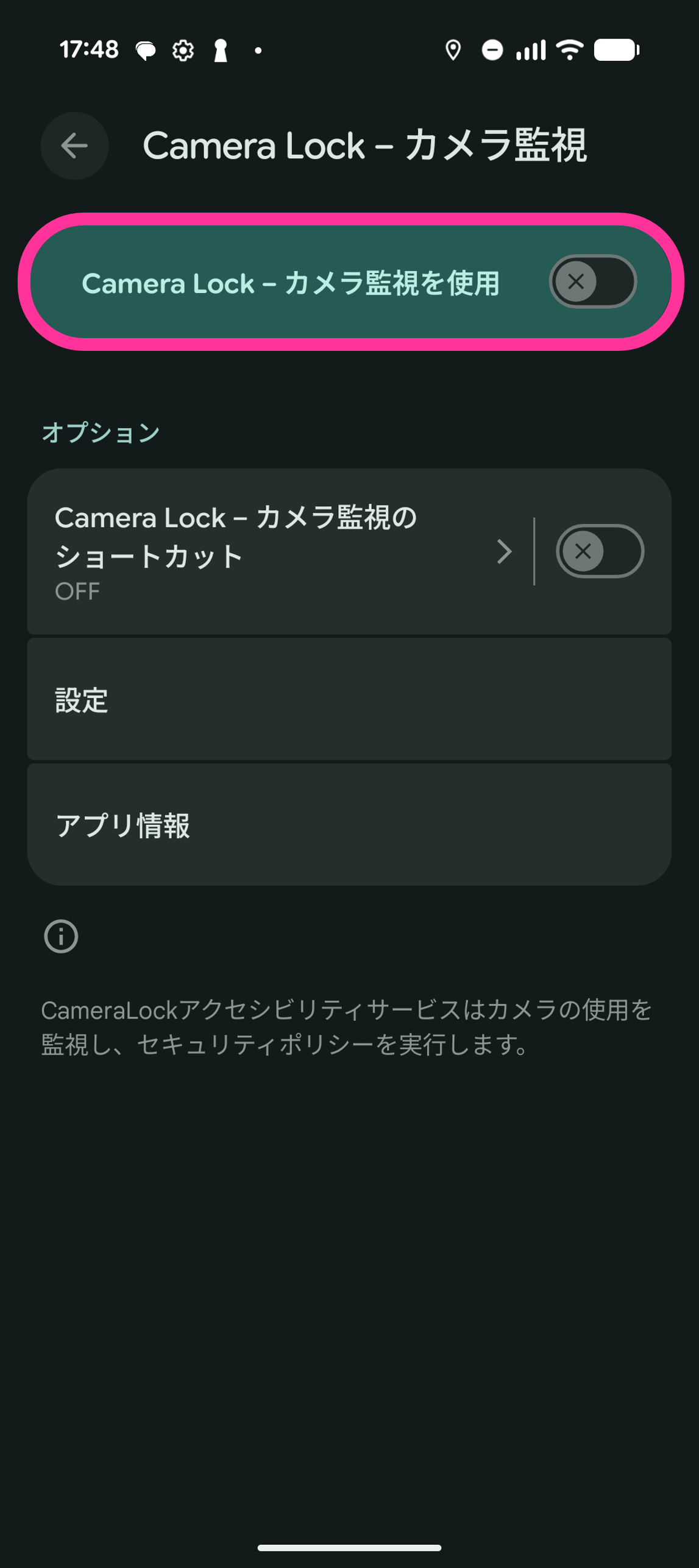 8. 「Camera Lock - カメラ監視を使用」を「ON」にします。