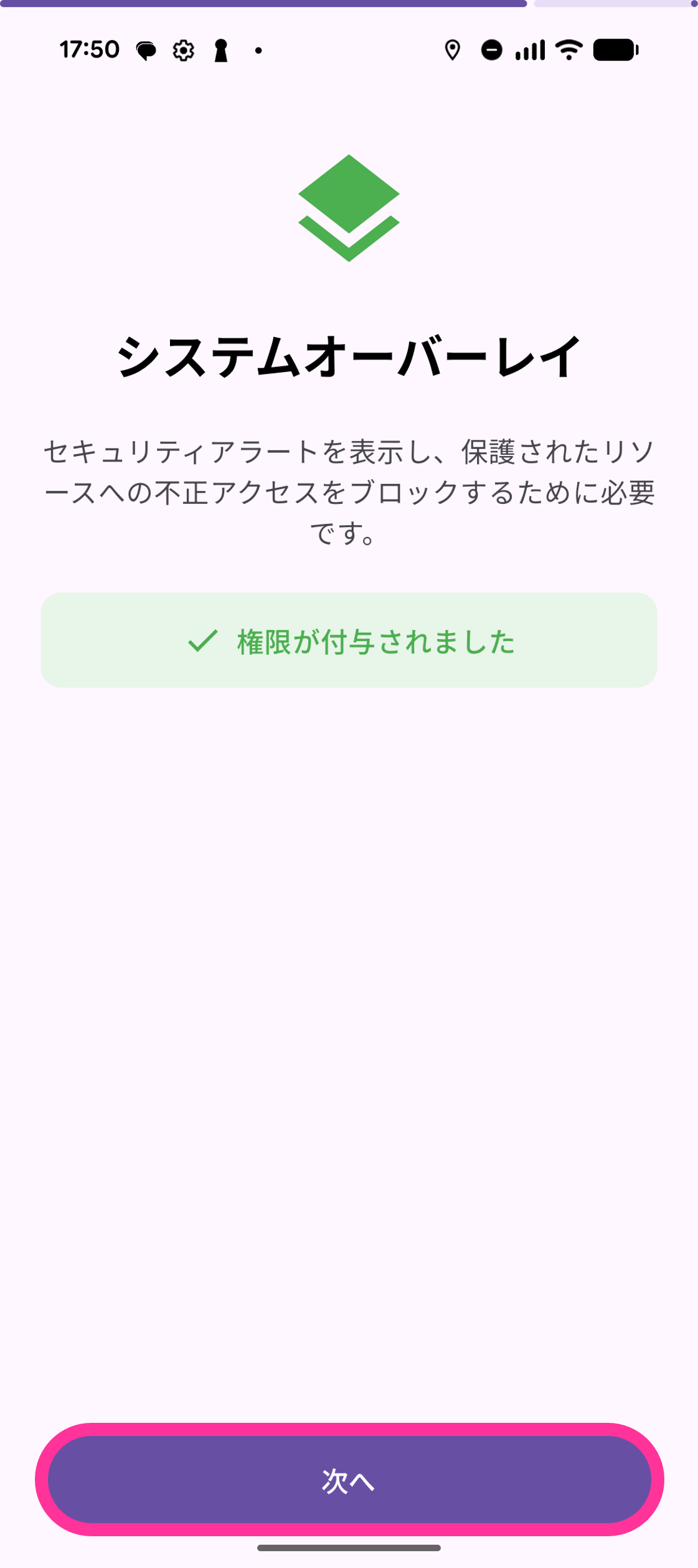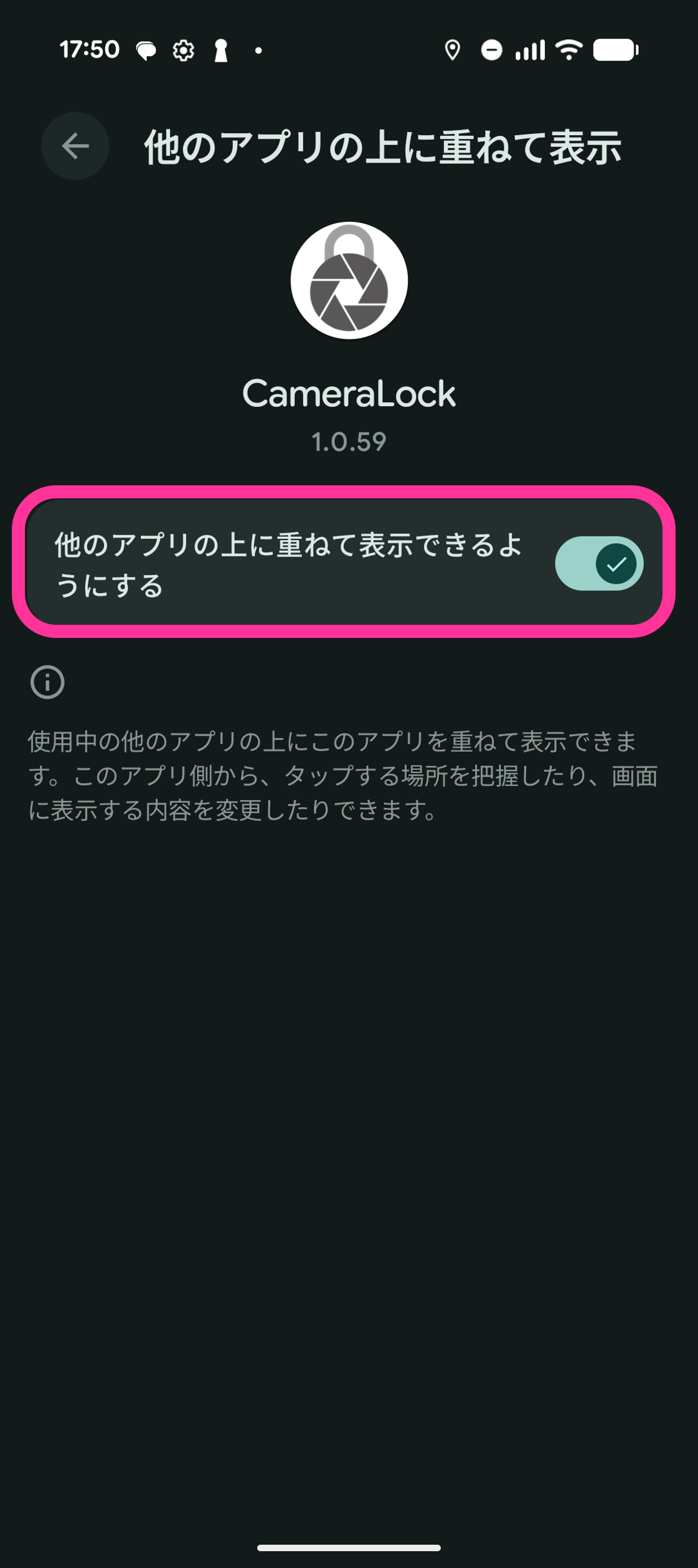 14. 「他のアプリの上に重ねて表示できるようにする」を「ON」にします。