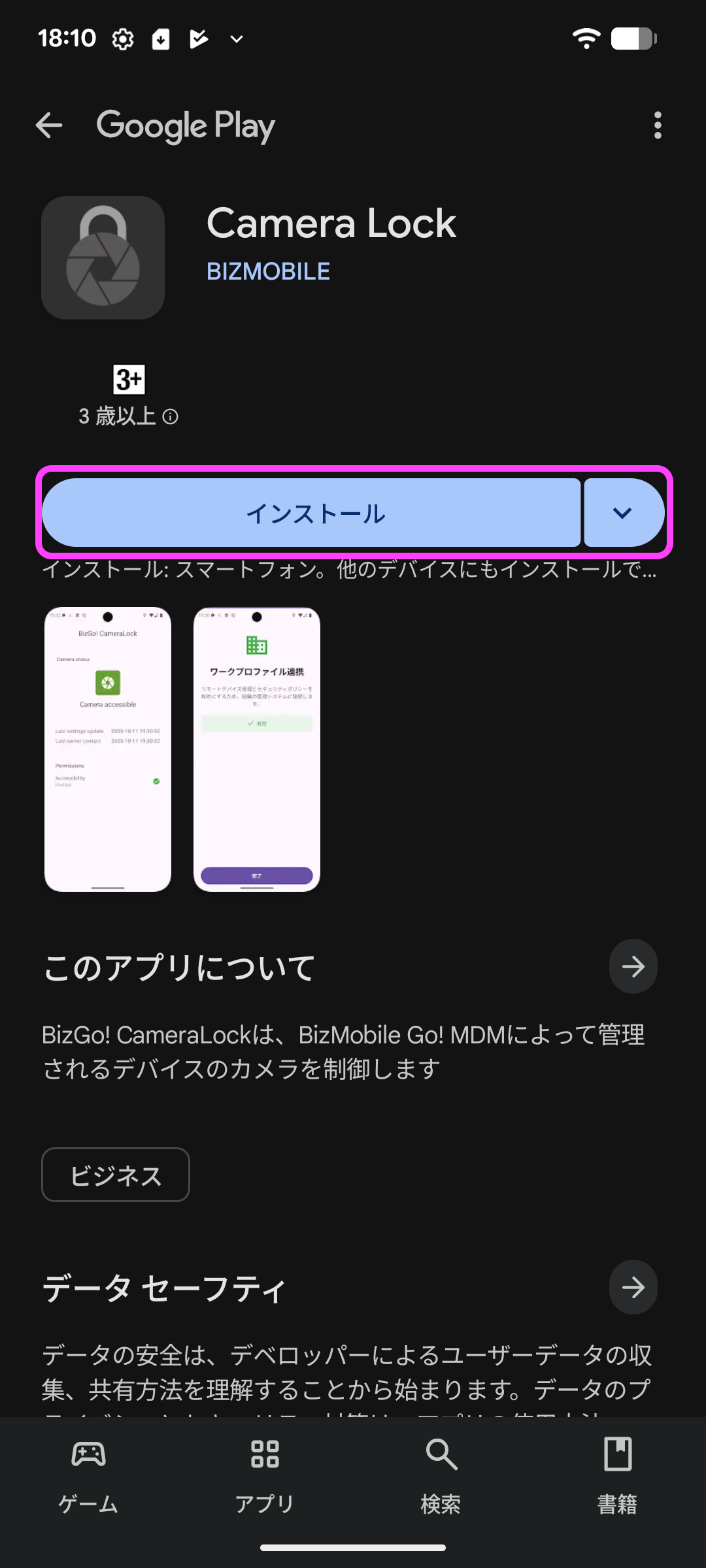 3. 表示された「BizGo! CameraLock」アプリの「インストール」をタップします。