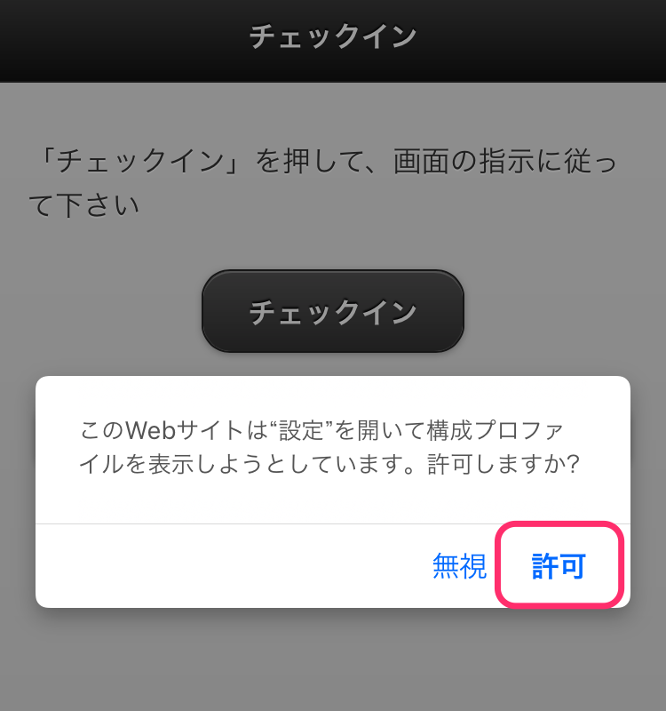 1. このWebサイトは“設定”を開いて構成プロファイルを表示しようとしています。許可しますか?のメッセージが表示されたら、[許可]をタップします。