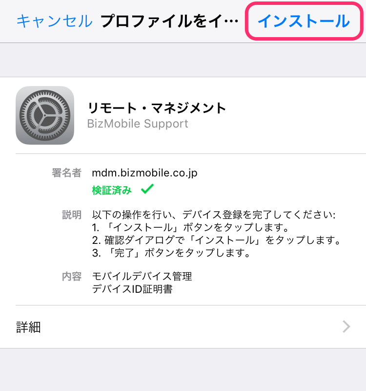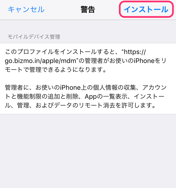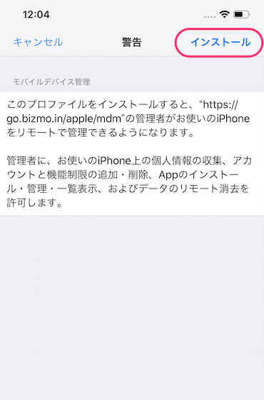 1. プロファイルをインストール画面が表示されたら、[インストール]をタップします
