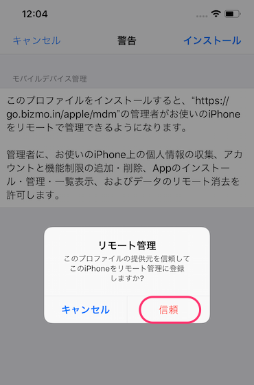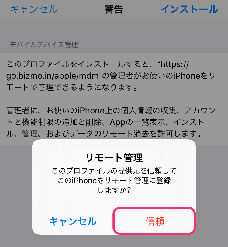 1. リモート管理ポップアップが表示されたら、[信頼]をタップします。