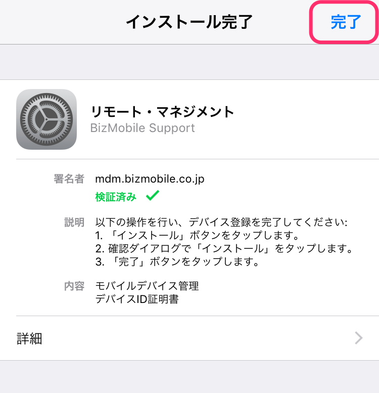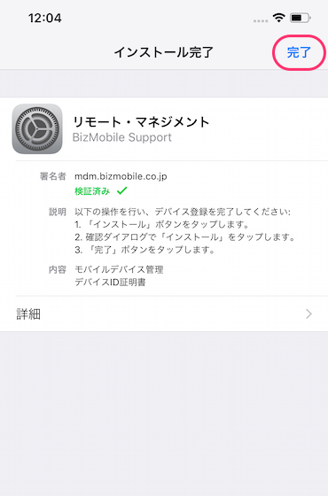 1. インストール完了画面が表示されたら、[完了]をタップします。
