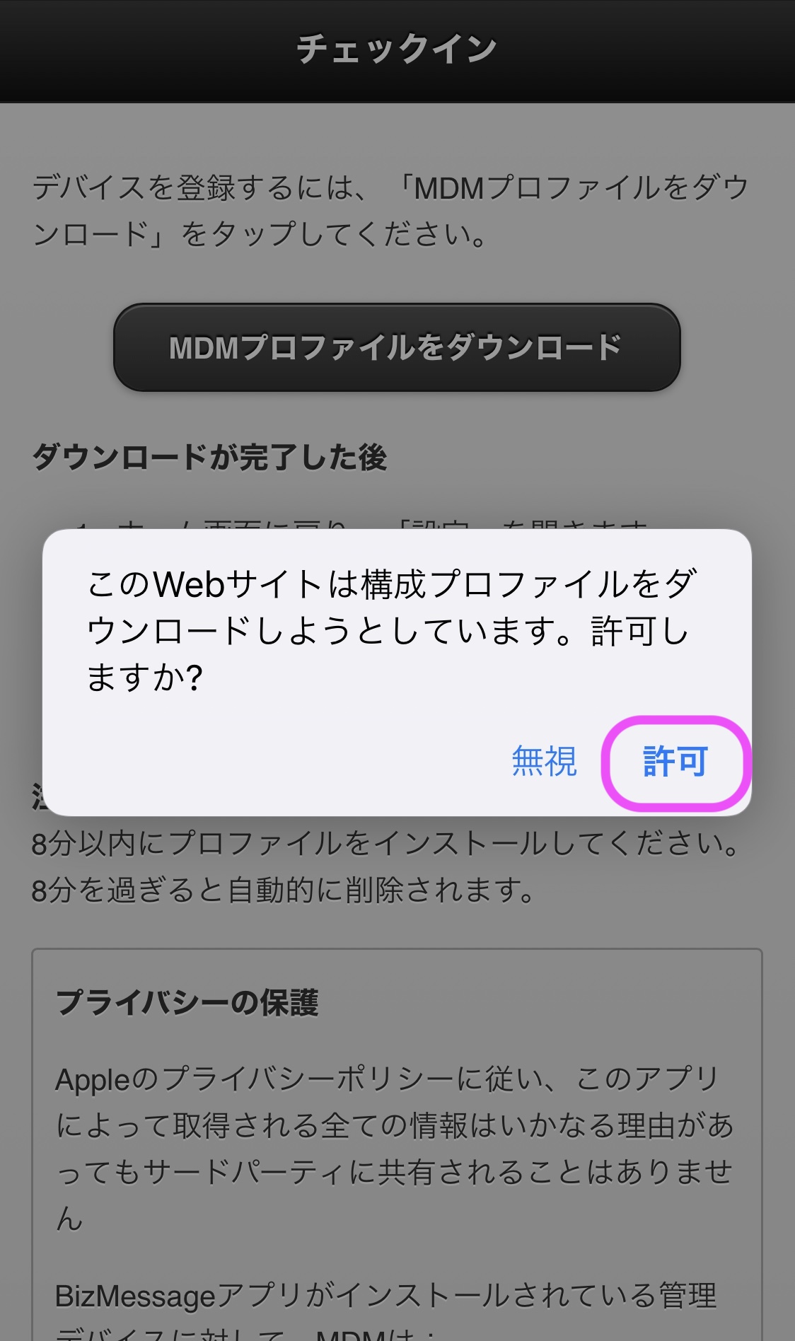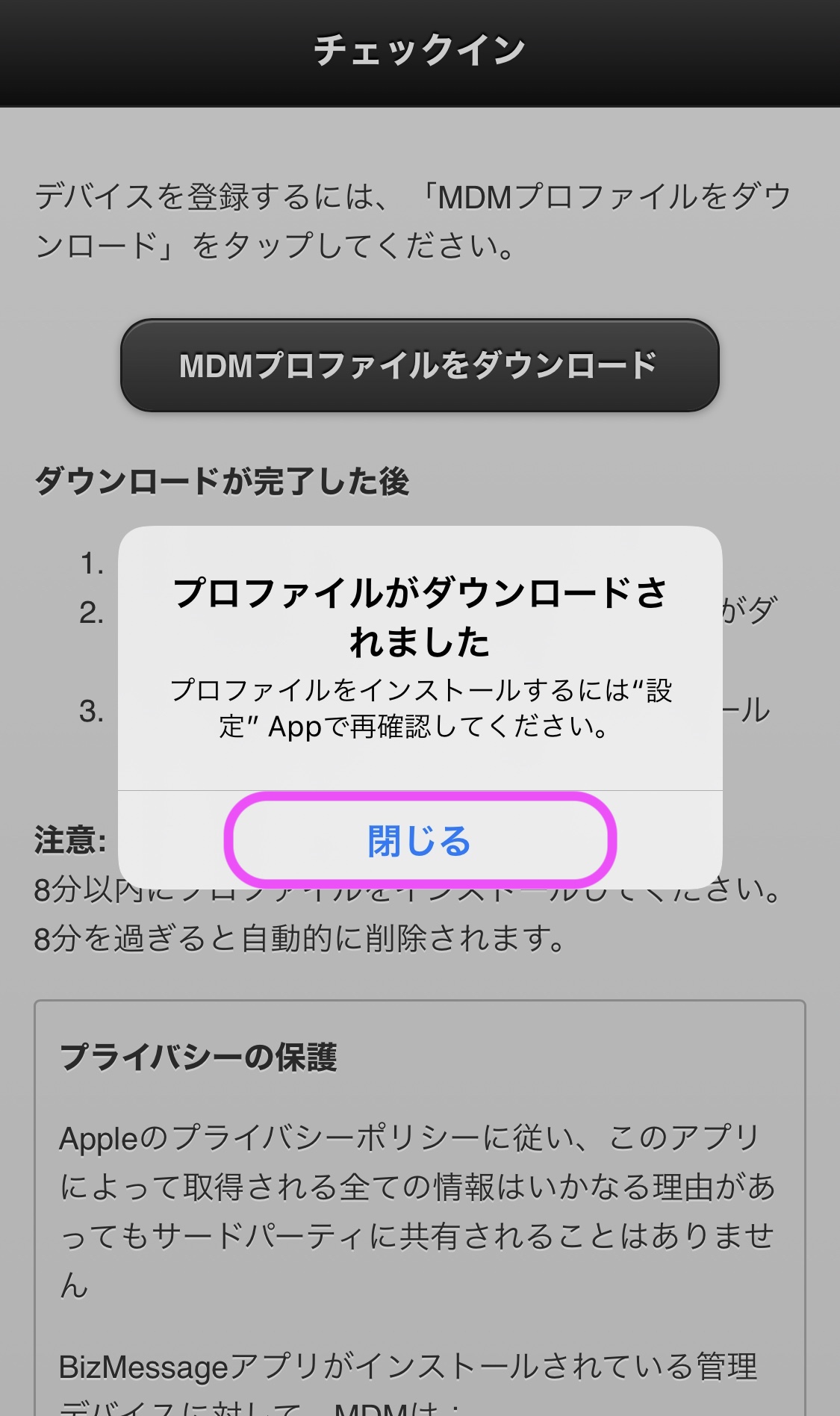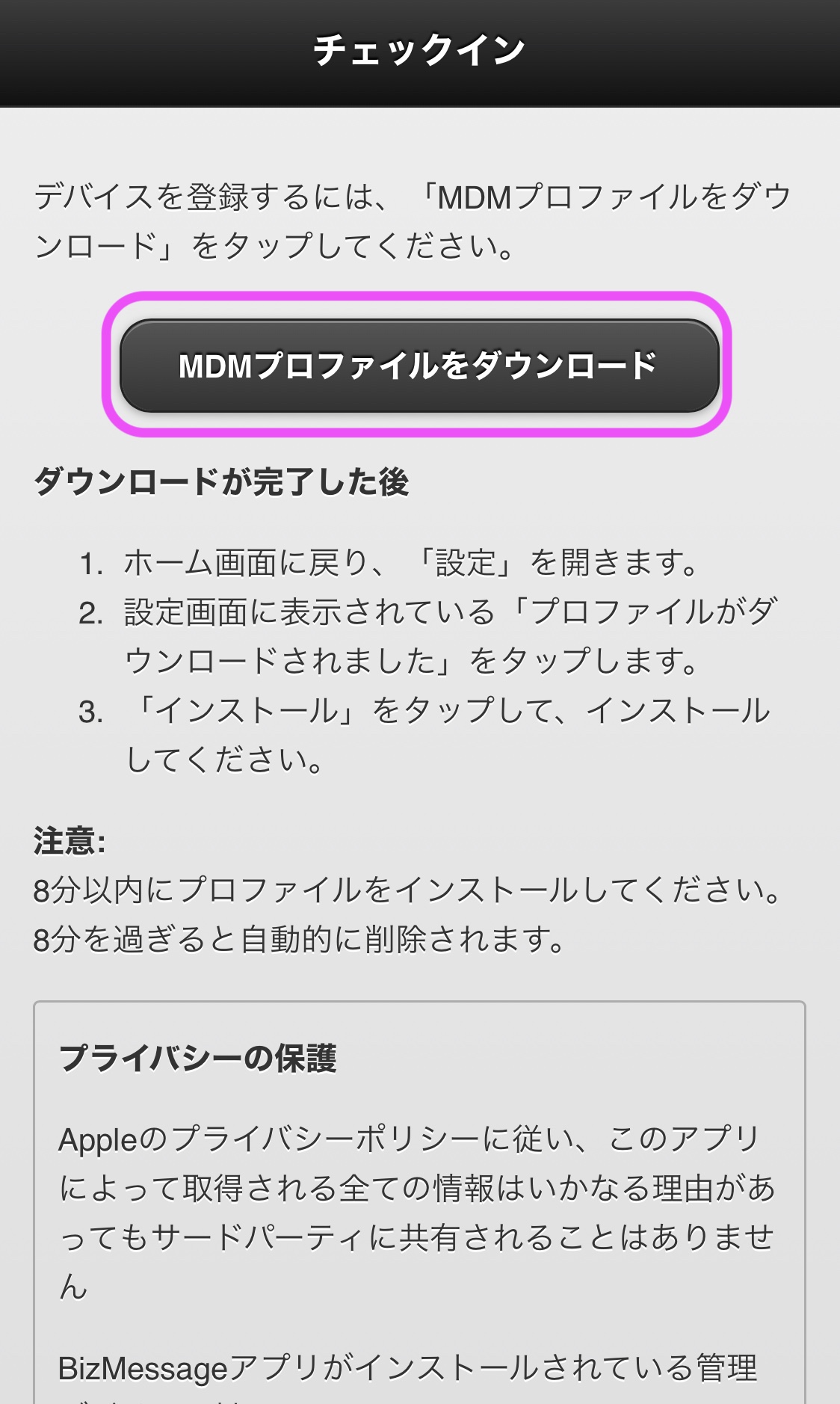 1. チェックイン画面にて、[MDMプロファイルをダウンロード]をタップします。