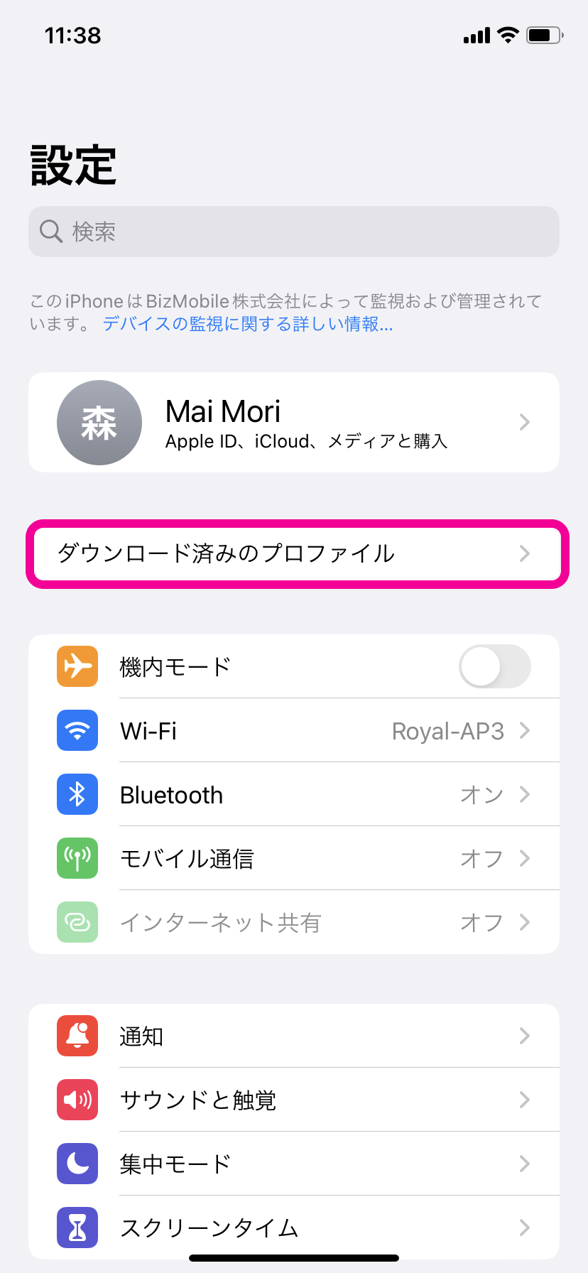 1. 設定画面に表示されているダウンロード済みのプロファイルをタップします。
