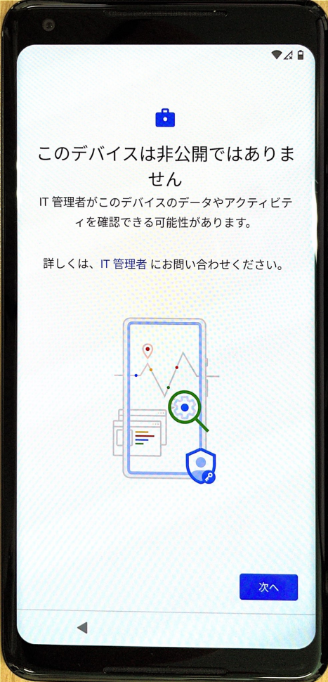 MDMへの登録は、デバイスを初期化後、デバイスの画面に表示される指示に従って使用可能な状態にする(アクティベーション)のみでデバイスオーナー設定とBizMobile Go!へのチェックインまで自動的に完了します。