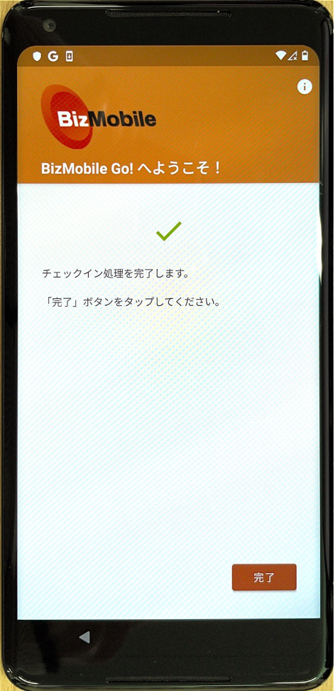 1. BizMobile Go!Androidエージェントの画面に遷移したら、[完了]をタップしてチェックインを完了させます。