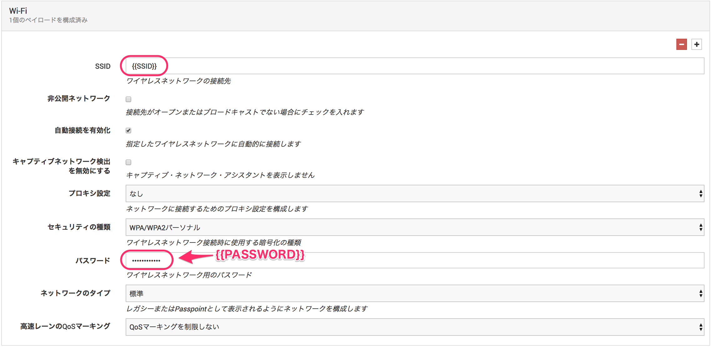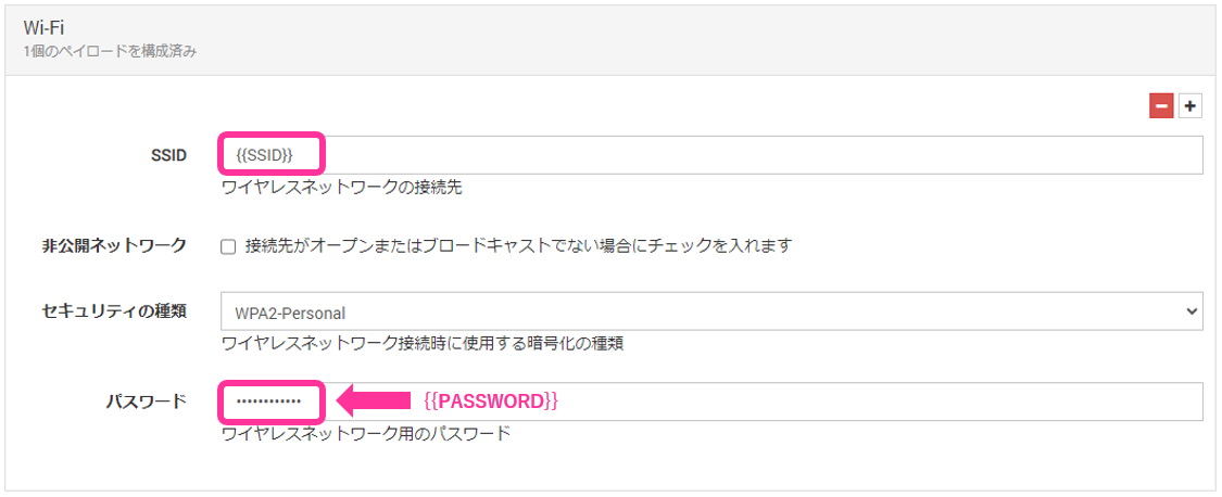 この例では、SSIDの項目に {{SSID}}、パスワードに{{PASSWORD}}と名づけています。