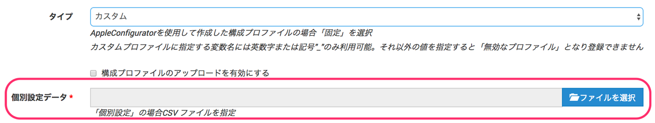 1. プロファイル作成画面の個別設定データに、手順4.で作成したCSVファイルを指定します。