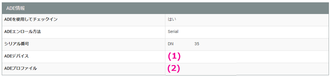 【構成】→【デバイス】画面から、確認したいデバイスの管理番号をクリックし、デバイス詳細情報画面にてADE情報の項目を確認します。