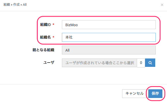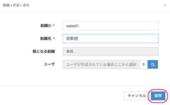 組織を作成します。組織ID(必須)、組織名(必須)、親となる組織、所属ユーザを指定できます。