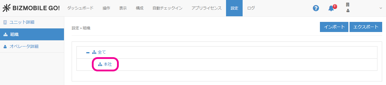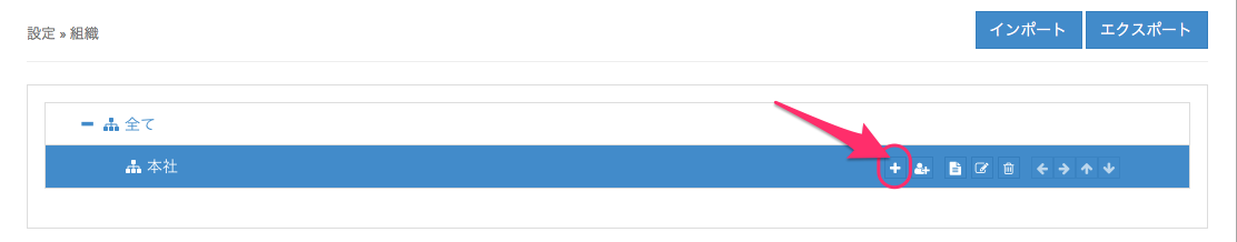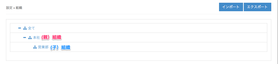 2. 上記で追加した組織本社を(親)組織として、(子)となる組織を追加します。