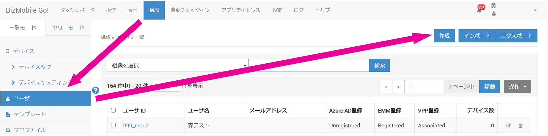 1. 【構成】 → 【ユーザ】画面から[作成]をクリックします。