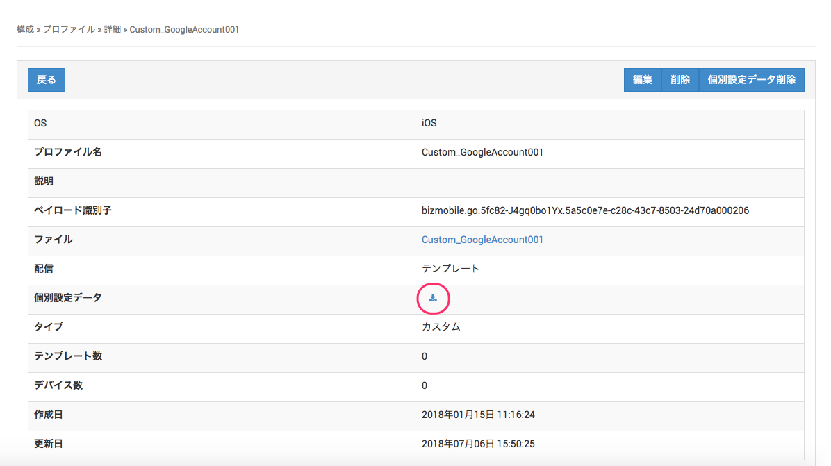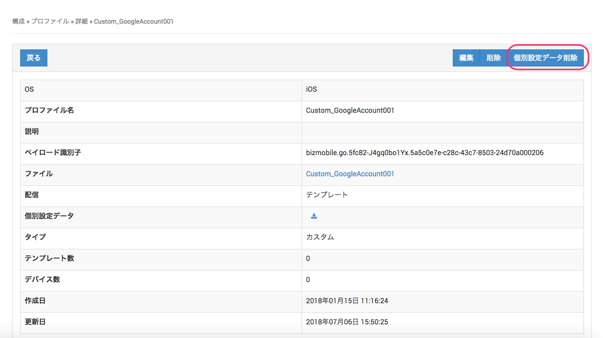 個別削除を実行した後、次回の同期実行時には指定された管理デバイスのプロファイル削除が行われますが、同じテンプレートに割り当てられたその他の管理デバイスへはプロファイルの再配付等は行われません。