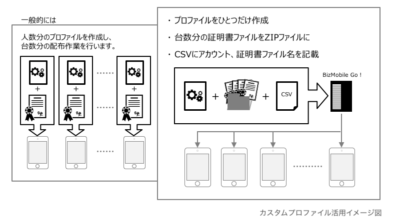 プロファイルとCSVファイルを利用して、デバイスごとに異なる設定値を配付することができます。