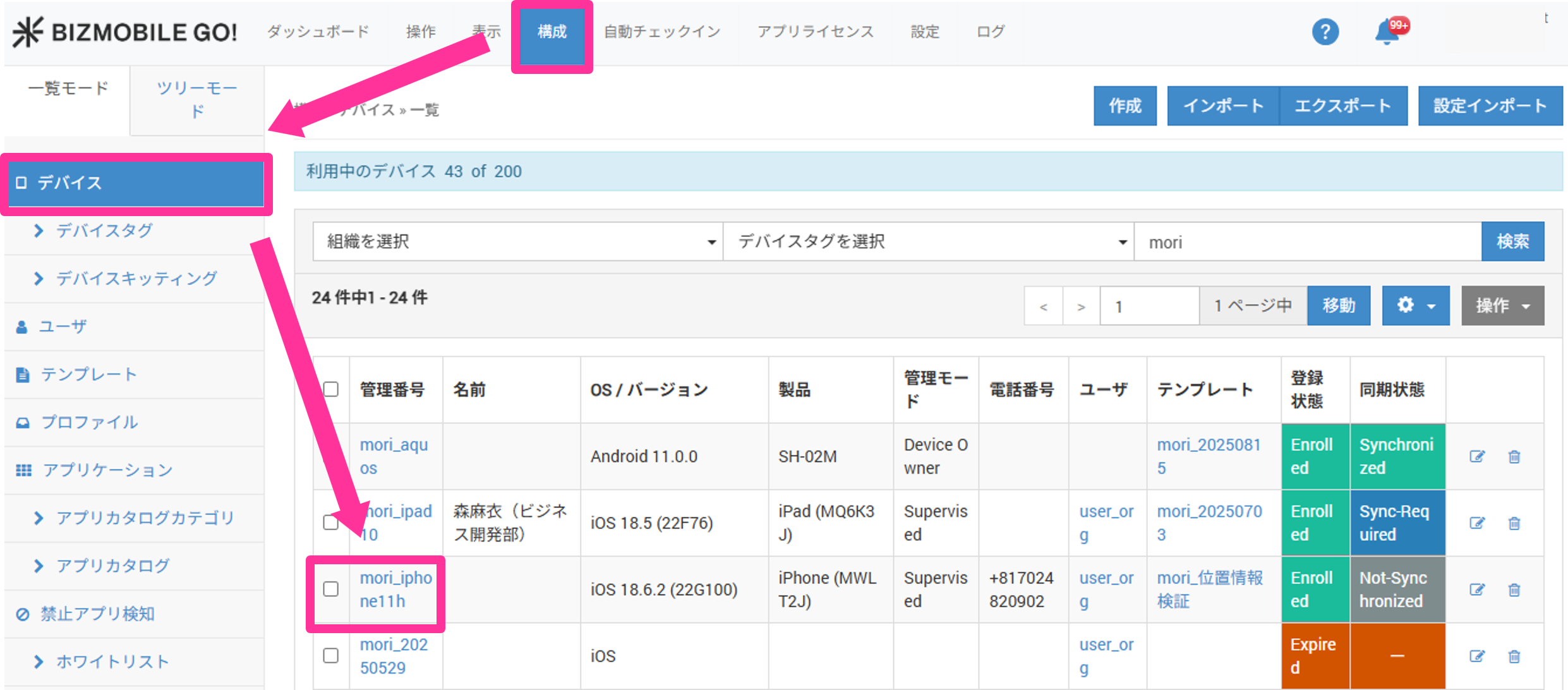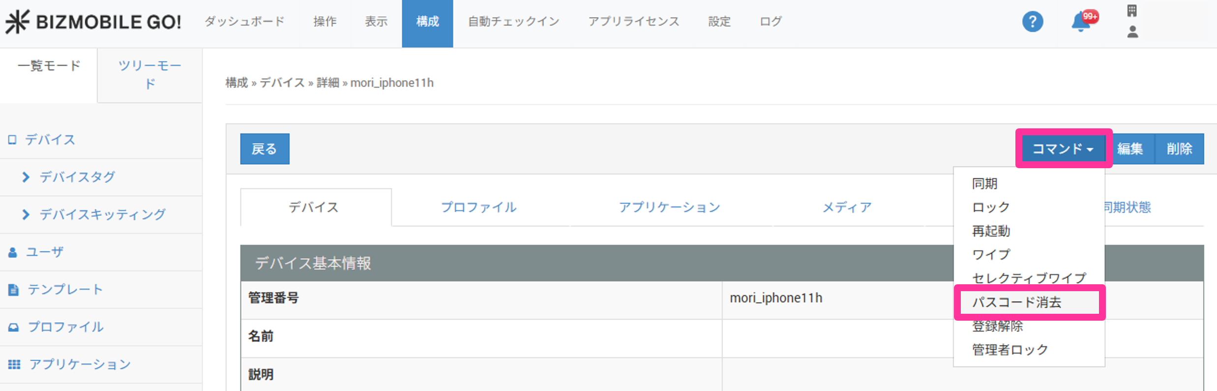 1. 【構成】→【デバイス】でパスコード消去を実行するデバイスの管理番号をクリックします。