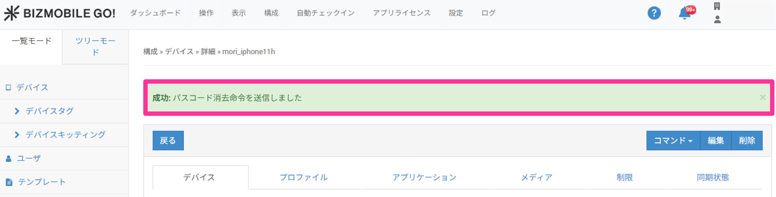 なお、プロファイルにてパスコードを必須にしている場合、パスコード消去後に管理デバイス上でパスコード再設定を要求するメッセージが表示されます。