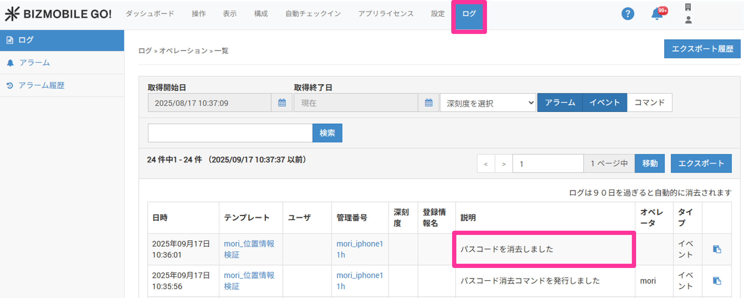 管理デバイスのパスコードを消去します。デバイス利用者がパスコードを忘れてしまった場合などに利用します。
