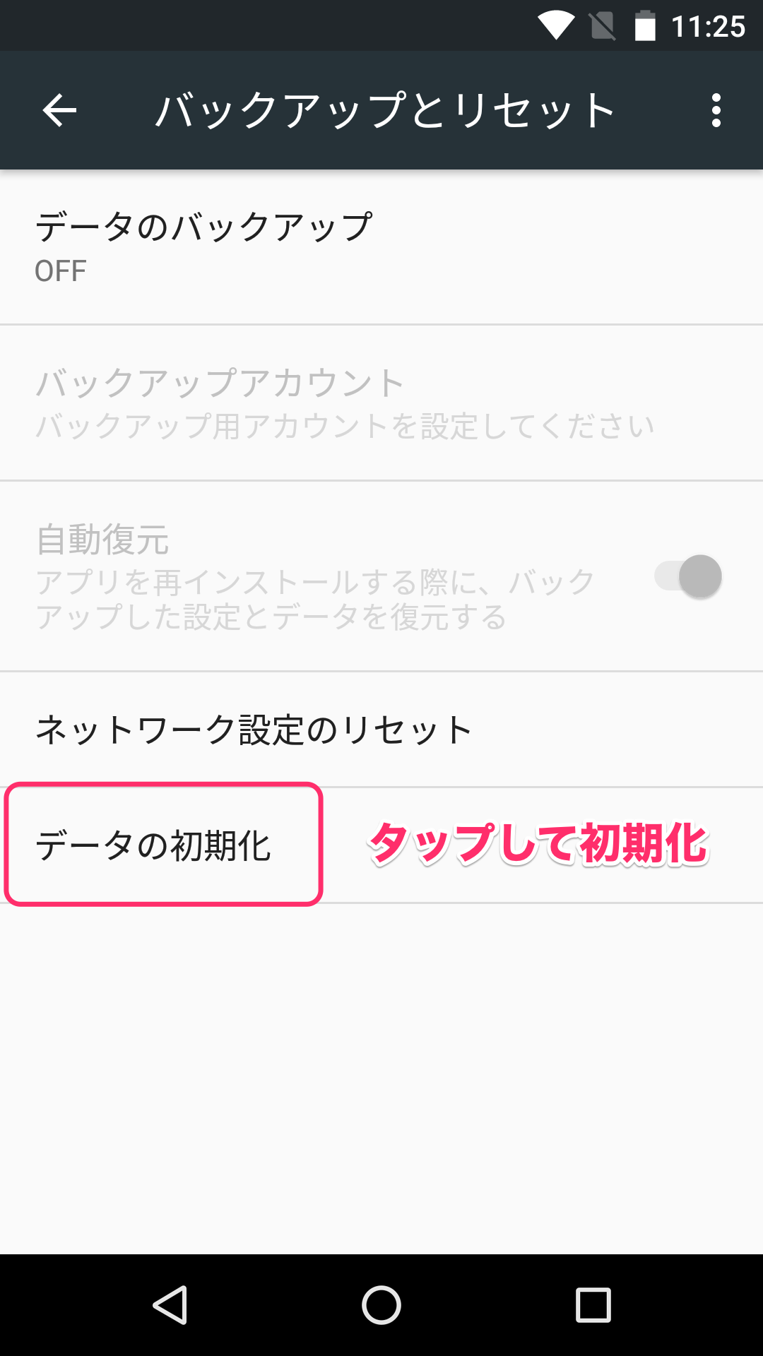 1. デバイスの初期化を行ないます。デバイスの設定メニューよりバックアップとリセットを選択し、実行します。