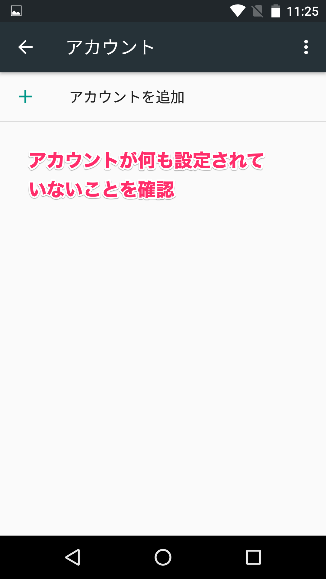 1. 初期化後、デバイスにGoogleアカウント等の各種アカウントが何も設定されていないことを確認します。
