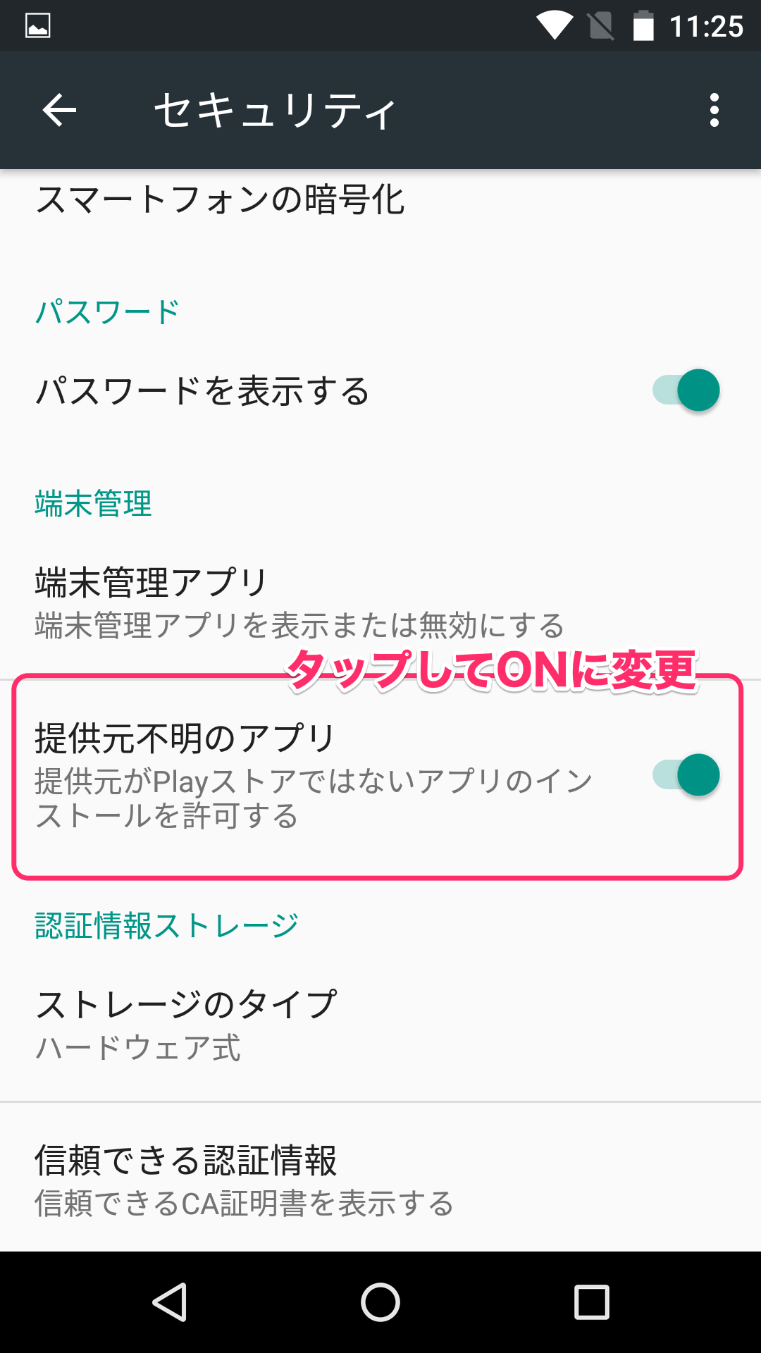 デバイスの設定メニューよりセキュリティを選択し、端末管理:提供元がPlayストアでないアプリのインストールを許可を有効にします。