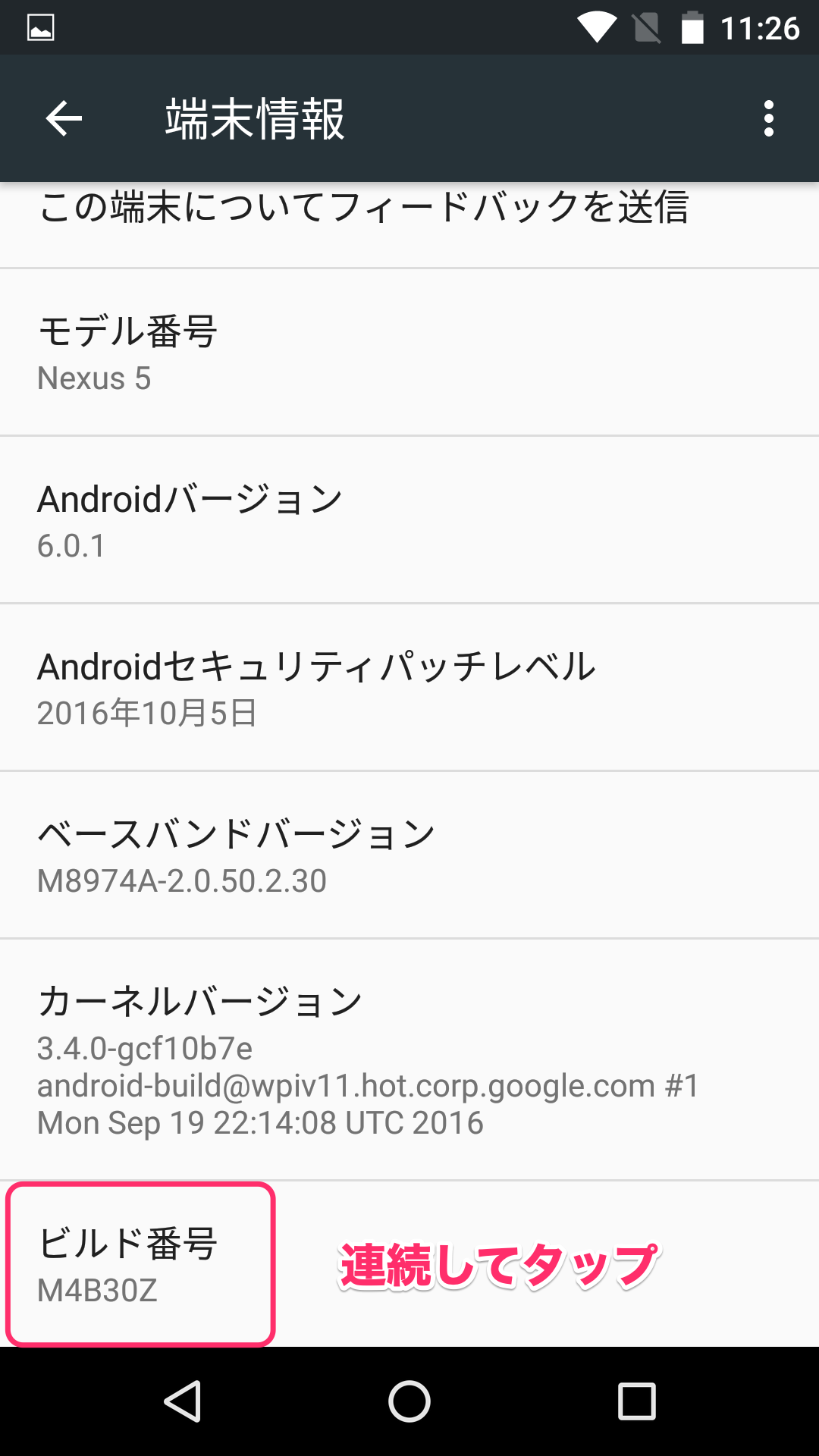 デバイスの設定メニューより端末情報を選択し、ビルド番号これでディベロパーになりましたが表示されるまでタップし続けます。