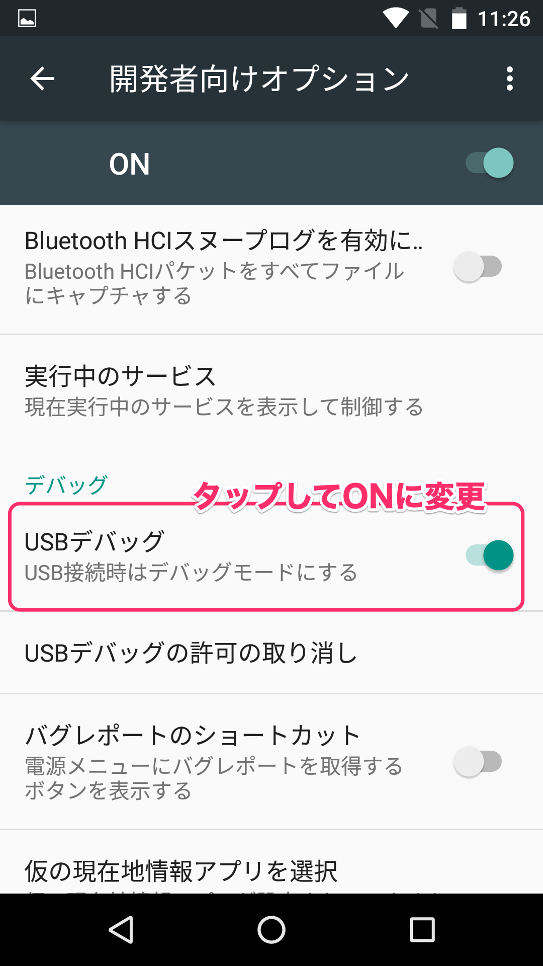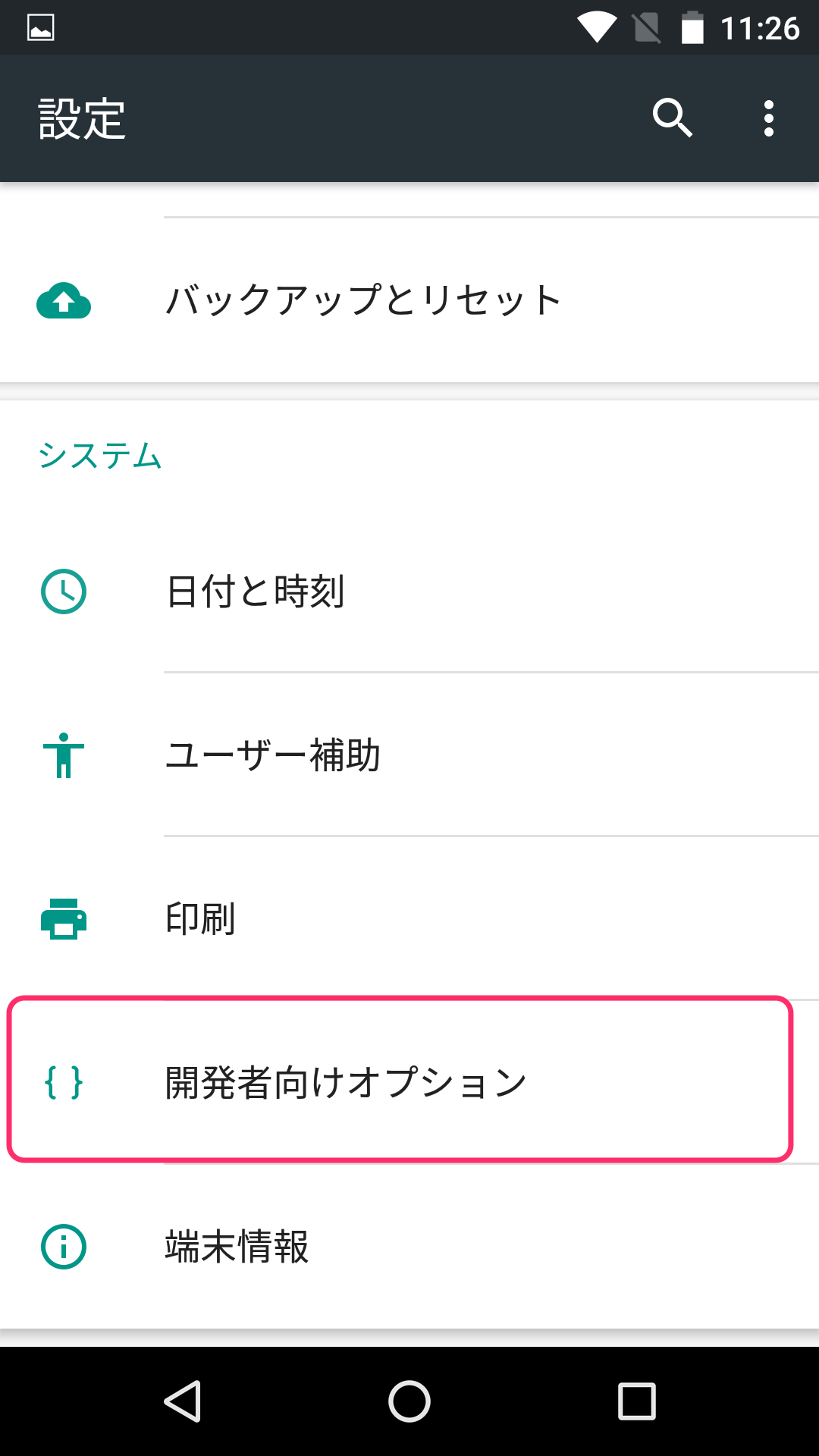 1. USBデバッギングを有効にします。デバイスの設定メニューより開発者向けオプションを選択し、デバッグ:USB接続時はデバッグモードにするを有効にします。