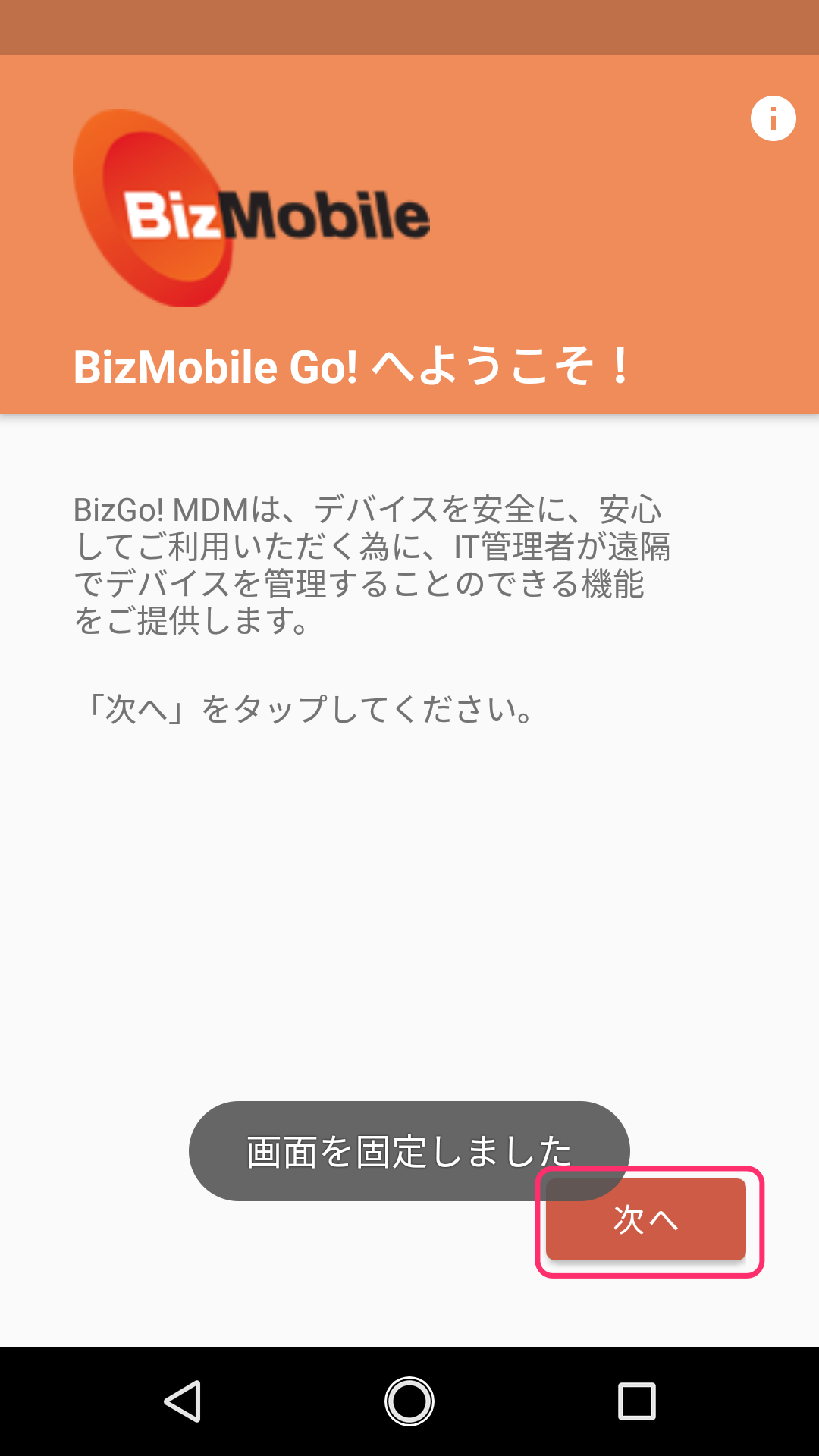 1. デバイスに自動的にインストールされた、Android用BizGo! MDMエージェントアプリをタップします。BizMobile Go!へようこそ!のページが開き、デバイスチェックインが完了するまでは、このページで画面が固定されます。