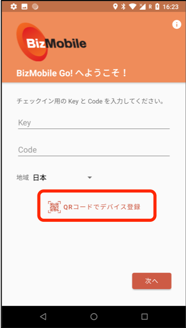 1. BizMobile Go!の管理画面で作成したデバイス情報から、Key=(チェックイン用キー)Code=(チェックイン用コード)を入力し、地域から日本を選択し次へをタップします。