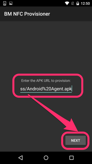 1. NFC Provisionerアプリを起動後、Enter the APK URL to provision:に以下の設定配付URLを入力し、[NEXT]をタップしてください。