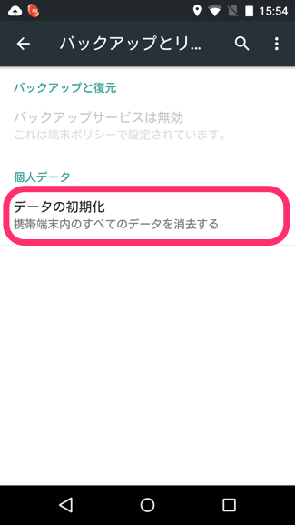 1. 設定対象デバイスの設定バックアップとリセットメニューを開き[データの初期化]をタップし、デバイスを工場出荷状態にリセットします。