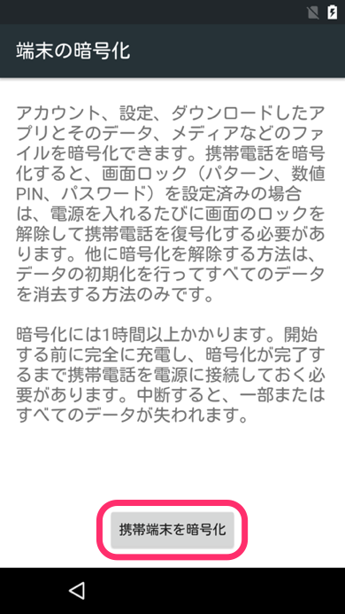 デバイスの暗号化の際は必ず、暗号化が完了するまでデバイスを電源に接続しておく必要があります。また、デバイスの電池残量が90%以上ないと、デバイスを電源に接続しても暗号化が開始されません([携帯端末を暗号化]ボタンがタップできません)。