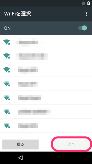1. 暗号化が完了すると、デバイスが再起動し、Wi-Fi設定画面が表示されます。アクセスポイントを選択し、パスワードを入力して、[次へ]をタップ