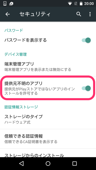 メニュー設定セキュリティメニューにある[提供元不明のアプリ]のスイッチをONに設定してください。