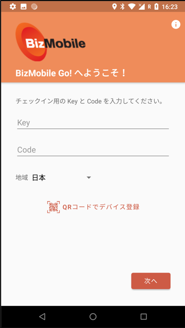 1. BizMobile Go!の管理画面で作成したデバイス情報から、Key=(チェックイン用キー)Code=(チェックイン用コード)を入力し、RegionからJapanを選択し次へをタップします。
