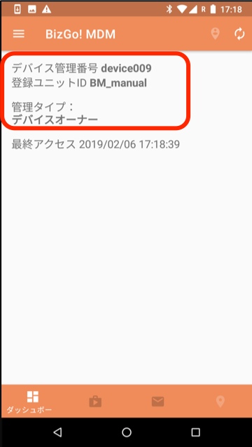 デバイスを管理できるようにするための最終ステップとしてデバイスでチェックイン操作を行います。チェックインが完了するとMDMデバイスとしてBizMobile Go!への登録が完了となり、デバイス管理ができるようになります。