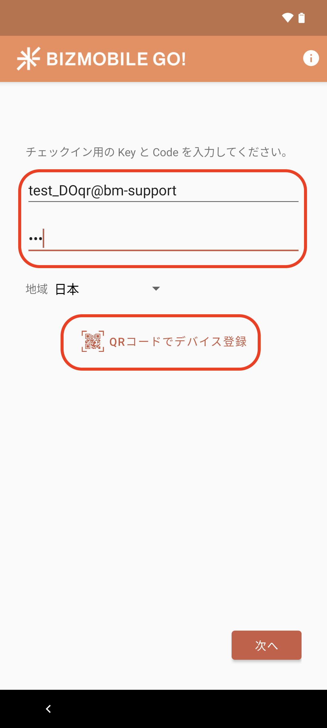 チェックイン用QRコードを読み込み、次へをタップします。