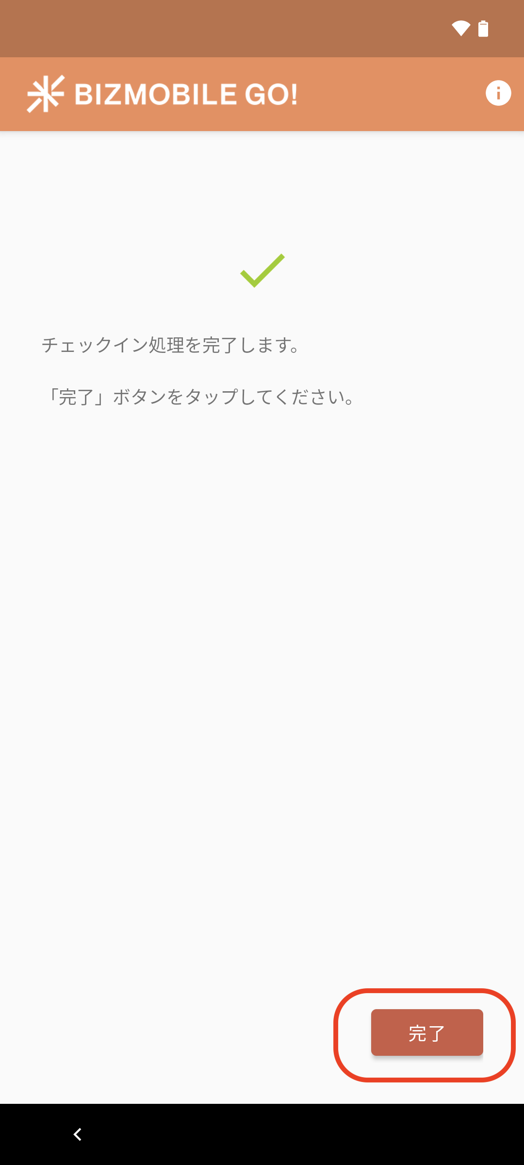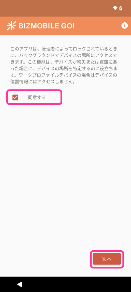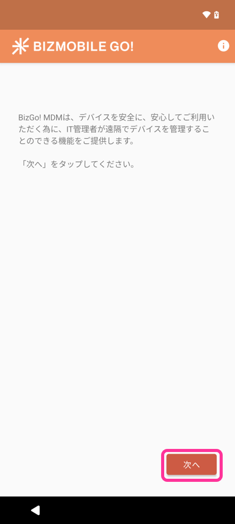 デバイスを管理できるようにするための最終ステップとしてデバイスでチェックイン操作を行います。チェックインが完了するとMDMデバイスとしてBizMobile Go!への登録が完了となり、デバイス管理ができるようになります。