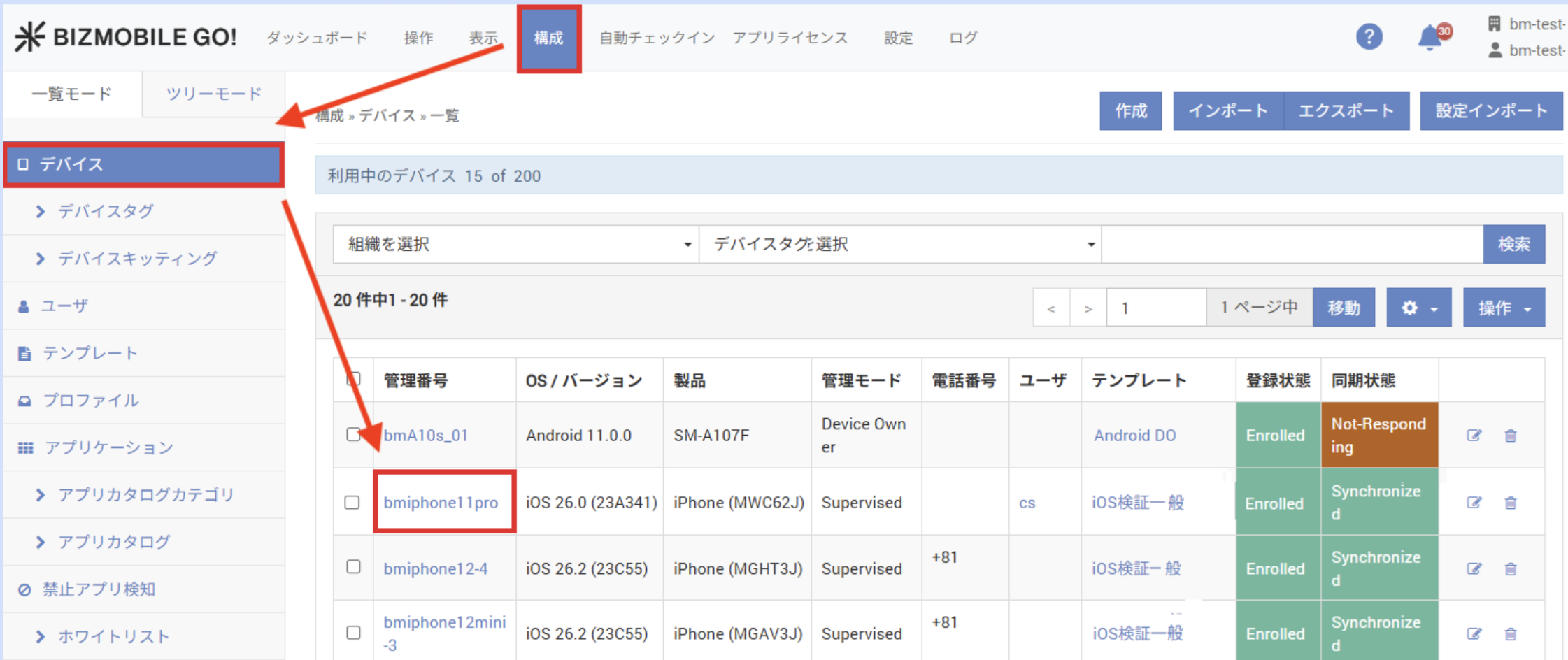 1. 【構成】【デバイス】 で登録解除を行うデバイスの管理番号をクリックします。
