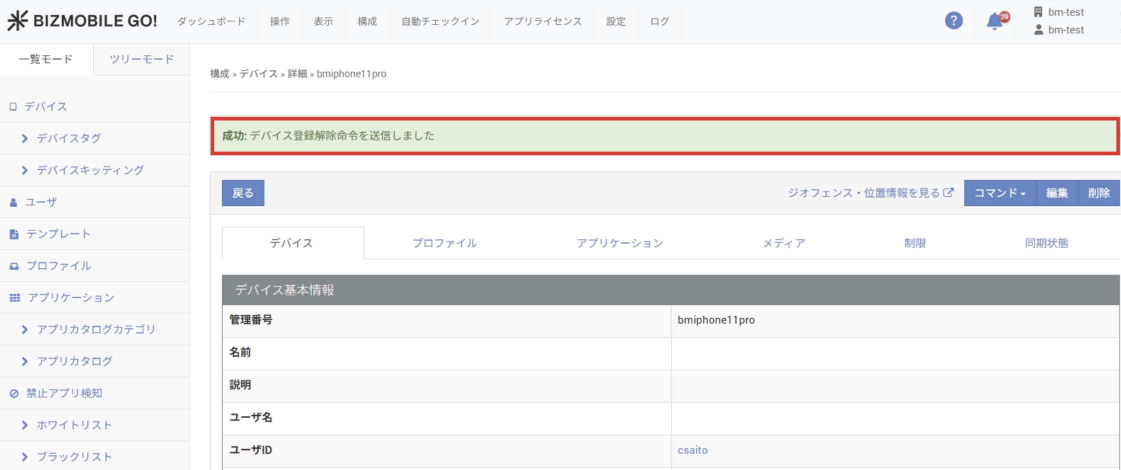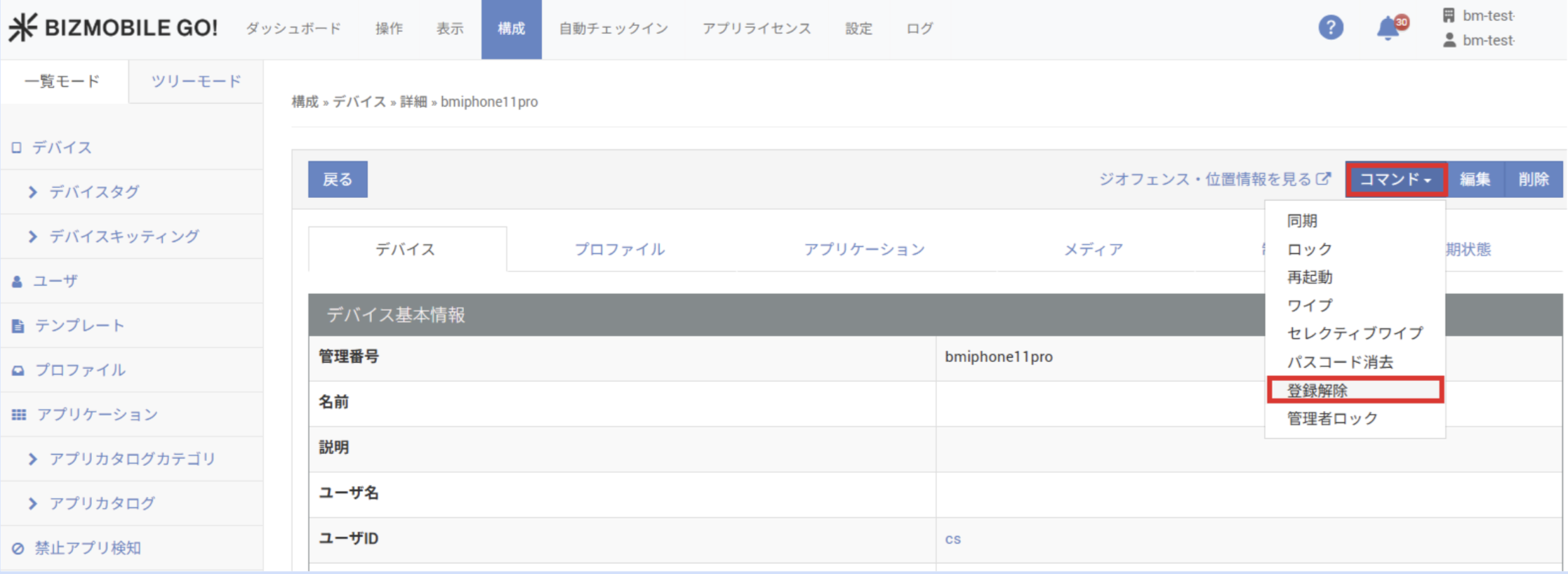 BizMobile Go!での端末(デバイス)管理を終了するコマンド(命令)を送信します。 コマンドがデバイス側で実行されると、管理状態は「解除済(Withdrawn)」となり、以降の管理は行いません。