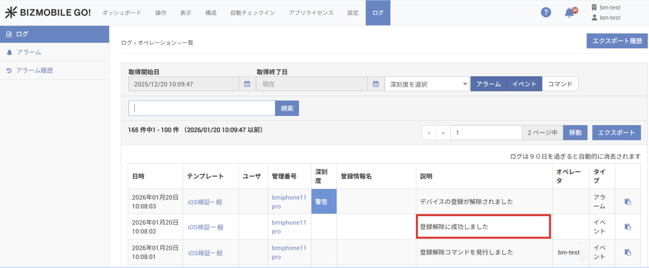 5. コマンドの実行状況はログで確認できます。 サーバからのコマンドにデバイスが応答すると登録解除が完了します。