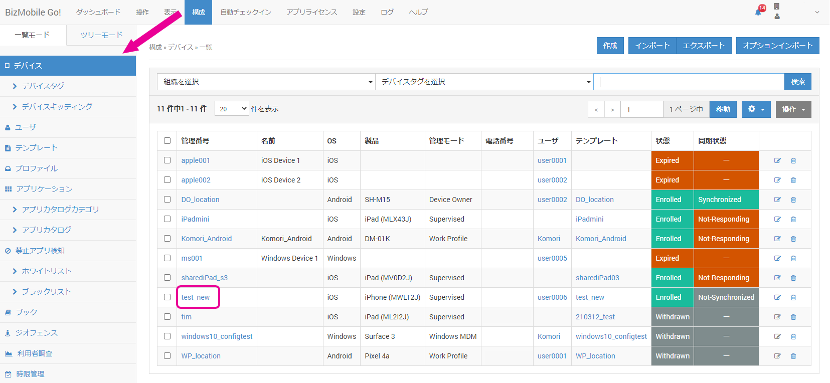 1. ダッシュボード>同期情報 の各項目をクリック、または、構成>デバイス のデバイス一覧から、確認したいデバイスを選択します。