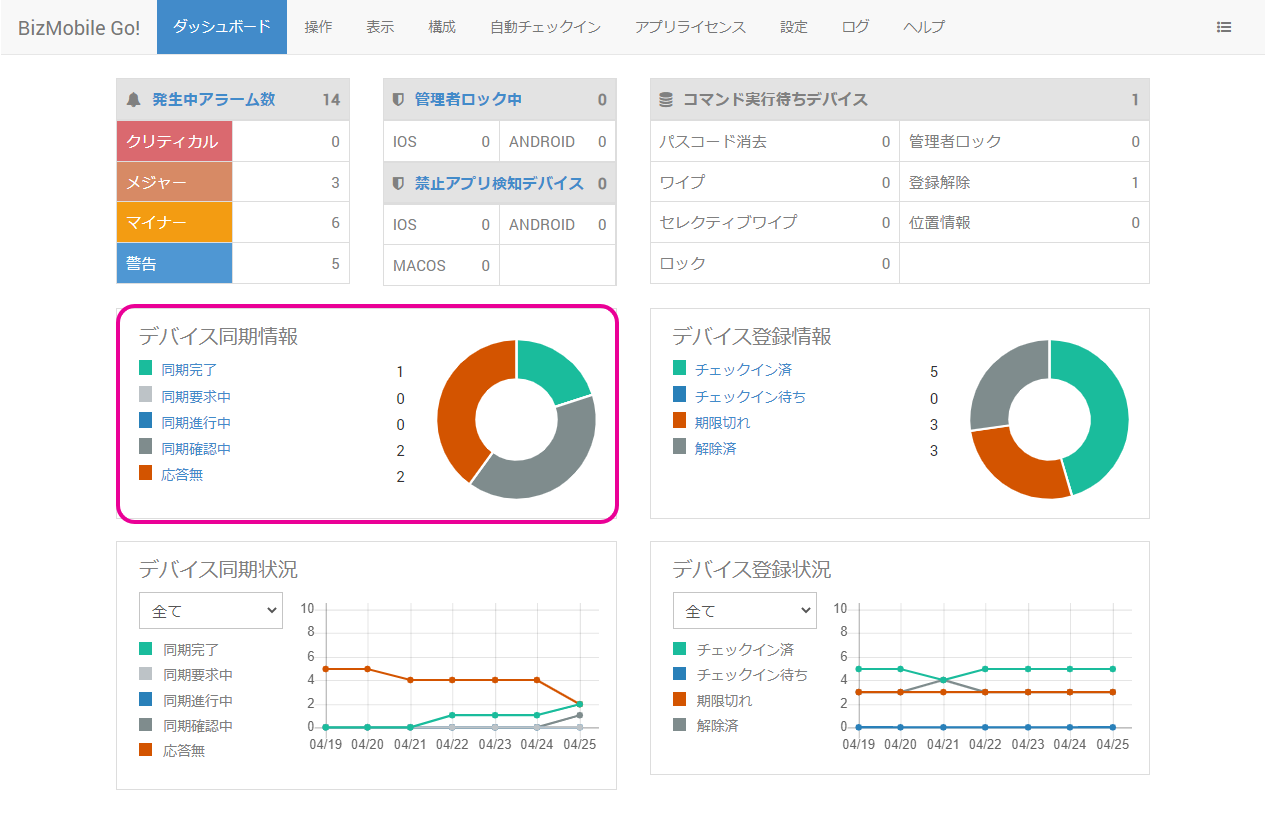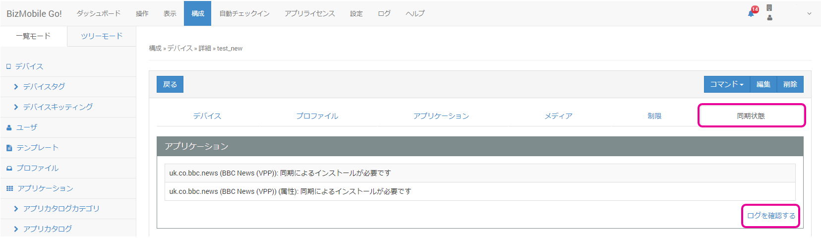 アプリを配付したり、プロファイルを編集した際など、その後にデバイスが同期完了状態となっていない場合、