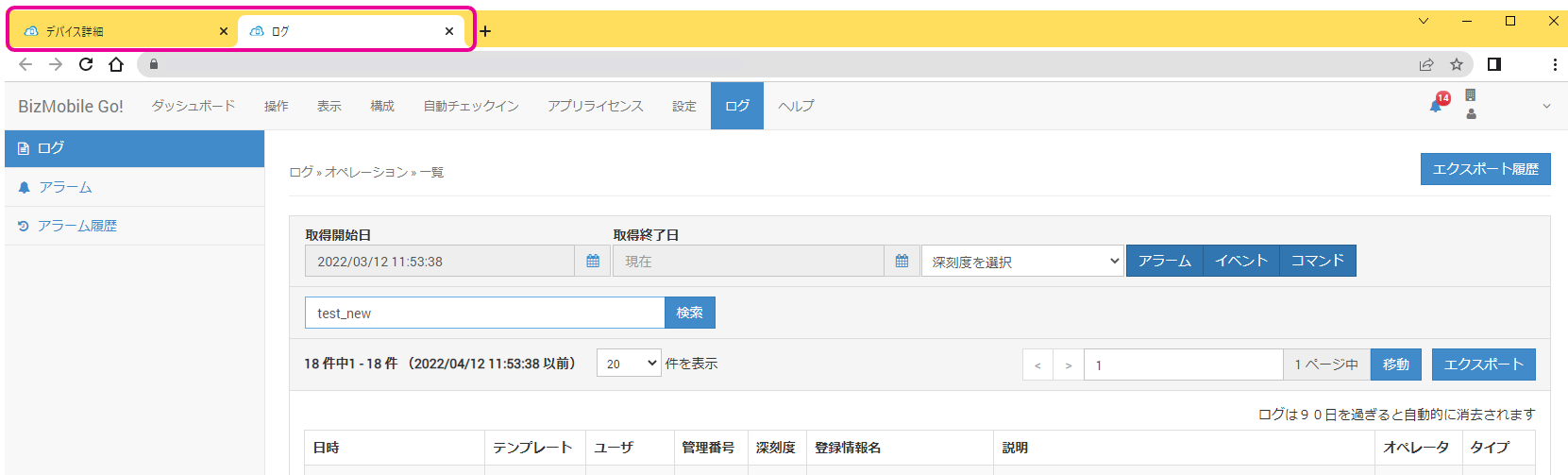 3. 別タブに、該当のデバイス情報で絞り込み済みのログ一覧が開き、詳細を確認できます。